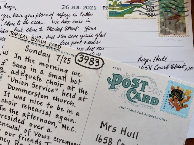 But here’s a fact: did you know postcards are disappearing? Some of you may remember my many posts on “The Snail Blog”…my friend Ellen’s answer to this blog wherein she mails a card to me everyday (#3983 arrived today…almost 11 years of daily notes). On her cross country trip this year from Vermont to Wyoming she noted all the places where she used to get postcards no longer have such things. People are not sending and writing postcards I guess, even though Ellen and Al send us cards with great frequency…