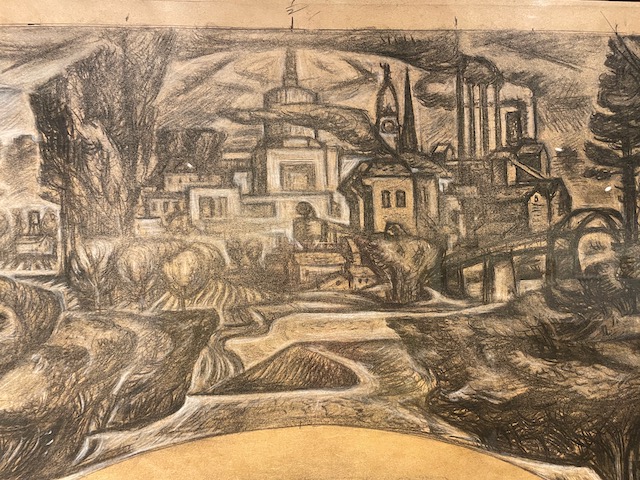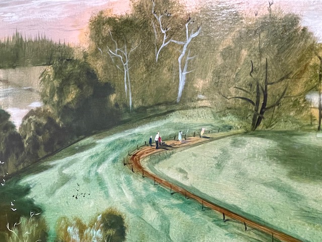 For me, the newly cleaned and framed section of a mural painted by Carl Hall is a knock out. The mural was originally painted for the Charles Wood house and in fact is a view toward Minto-Brown Island of the river at flood stage as seen from the Wood’s home where it graced the dining room wall for 50 years before being removed, conserved and donated to the museum.