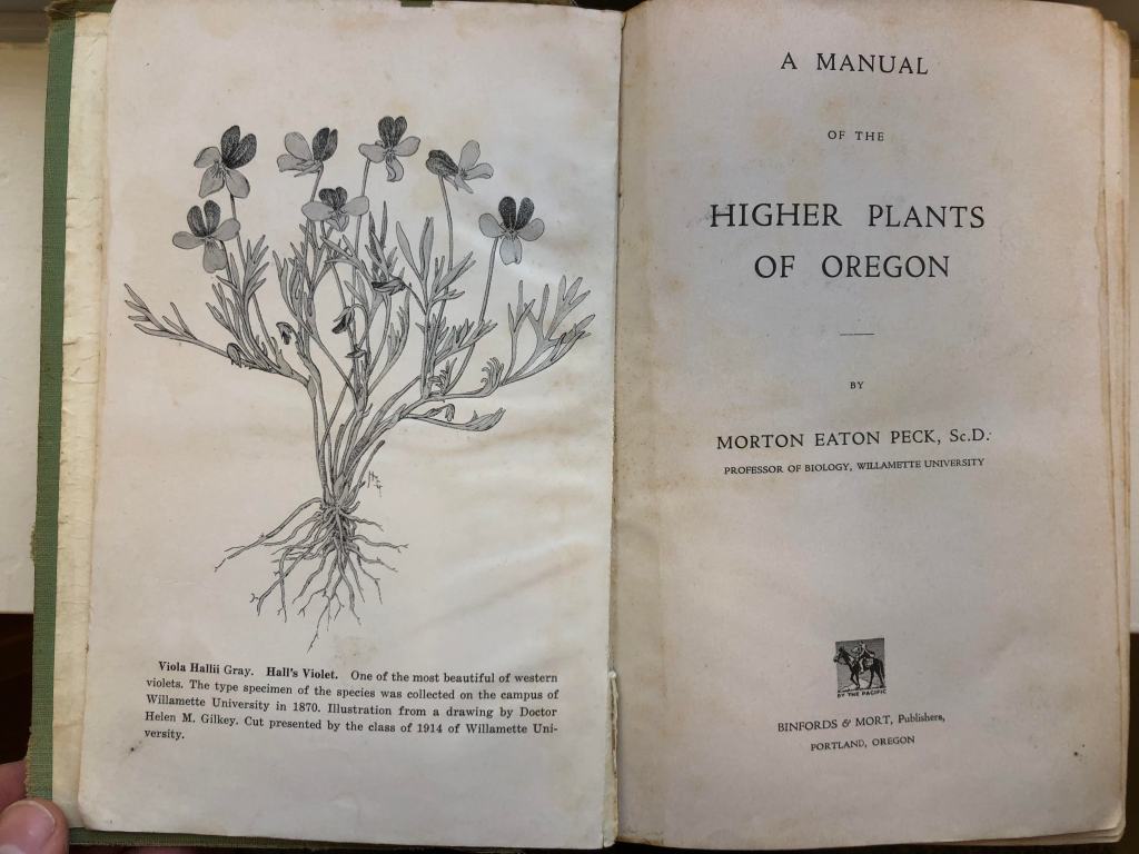 Botanist Morton Peck arrived at Willamette in 1908 to teach and also actively collected native plant material and compiled his own collection (a “herbarium”) now housed at Oregon State University. In 1941 Peck wrote “A Manual of the Higher Plants of Oregon” with Hall’s violet as the illustrated frontispiece (drawing by Dr. Helen M. Gilkey)