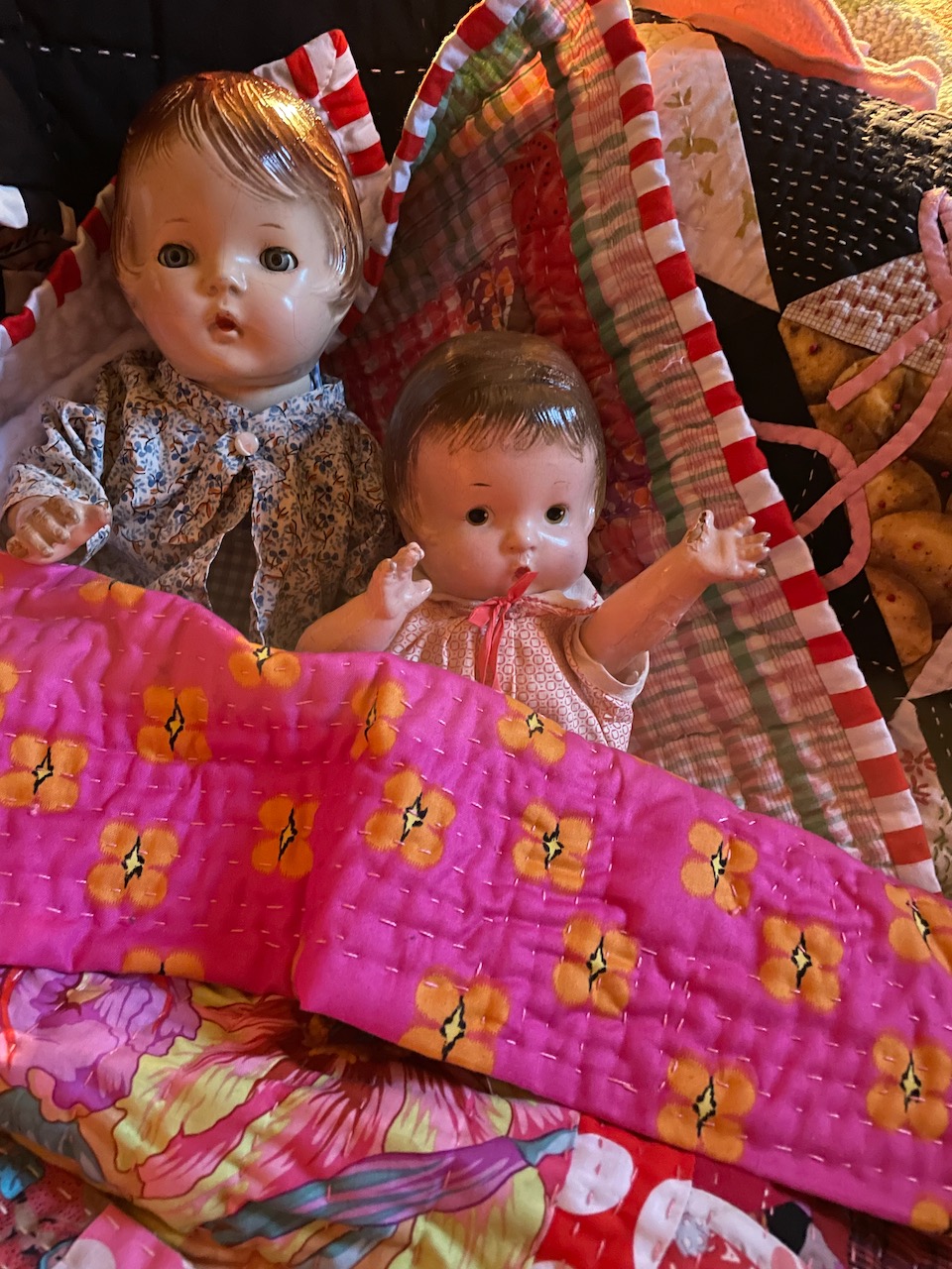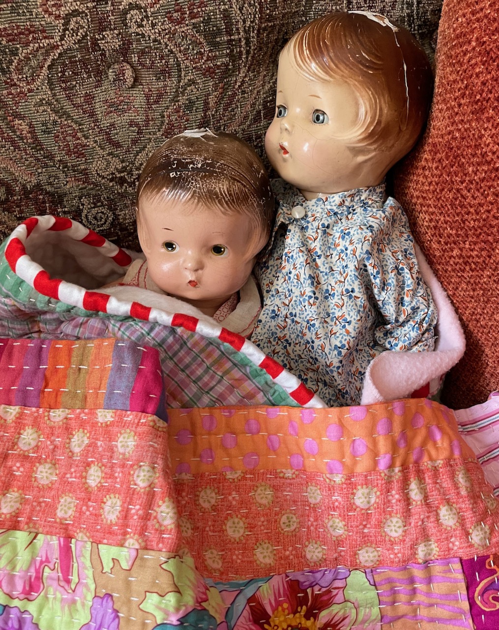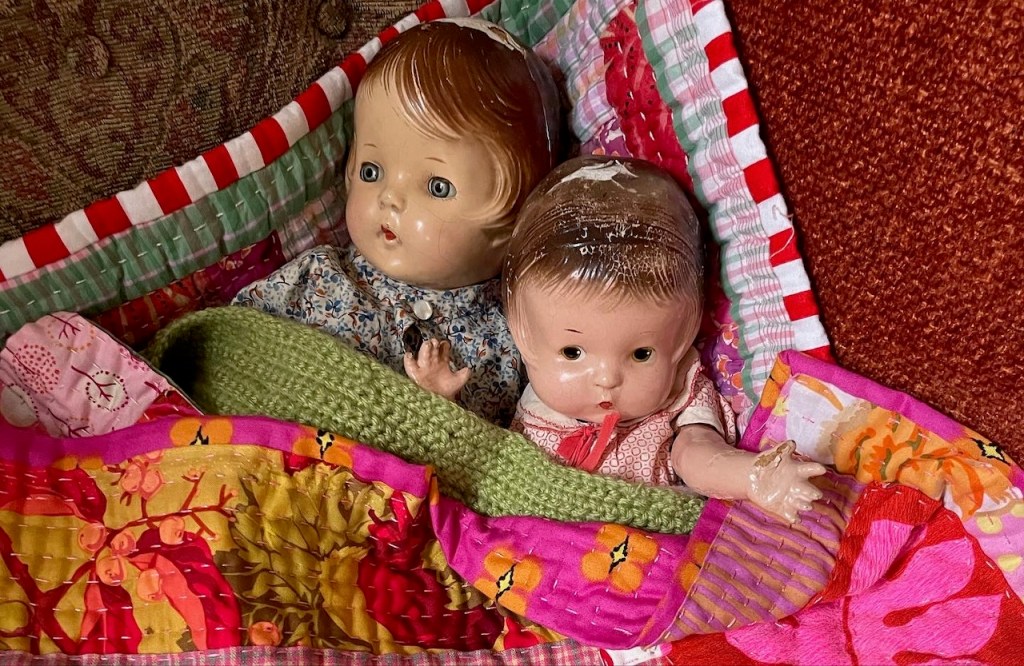 The doll on the right was my mother’s doll, now about 100 years old and called Patsy Ann. Her head was cracked and the top was peeling off, but Vivien liked her anyway…