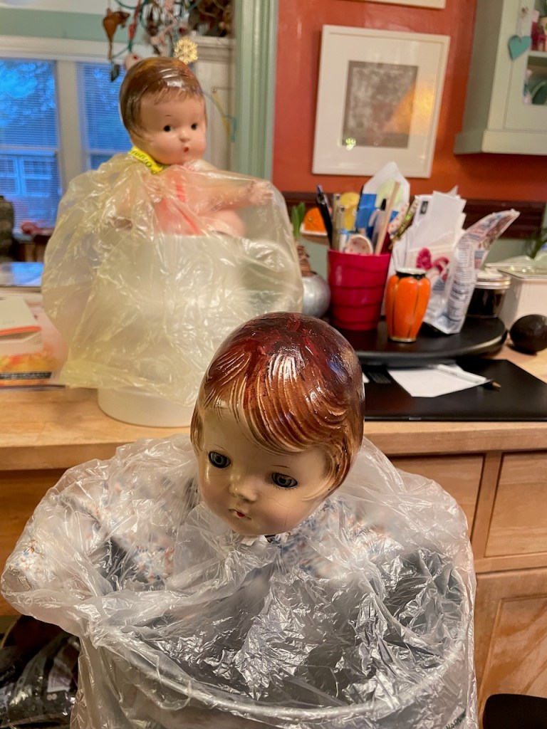 My friend Irene gave me the doll on the right…smaller but in reality…also named Patsy Ann. Vivien immediately began calling her “Fancy Ann” and the name suits her, but as you can see she came with a head also cracked and peeling. I had thought of just simply trying to spackle their heads, but never had gotten to it until I had to spackle my studio wall so they could paint it white on Monday
