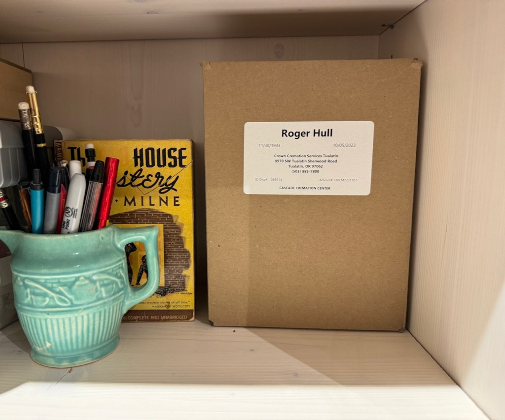 The. garbage company needs a death certificate, but the credit card doesn’t? ATT needs a death certificate to turn off his phone? And so on. Forms. I gave myself a month before I really dived into the death business with the invaluable help of our son, who knows how to navigate websites and…well..everything, better than I do. By then Roger’s ashes had been returned to us. Vivien “what’s in there?” Me: “Grandfather’s ashes, in a plastic bag, in the box.” Vivien: “Can you open it so I can put my hand in?” Me: “not today.”