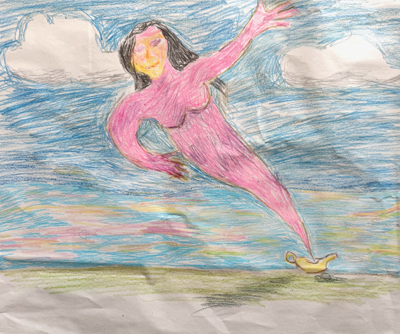 Vivien (5) and I (80) have been making crayon drawings on newsprint…just on the table whenever we have a minute