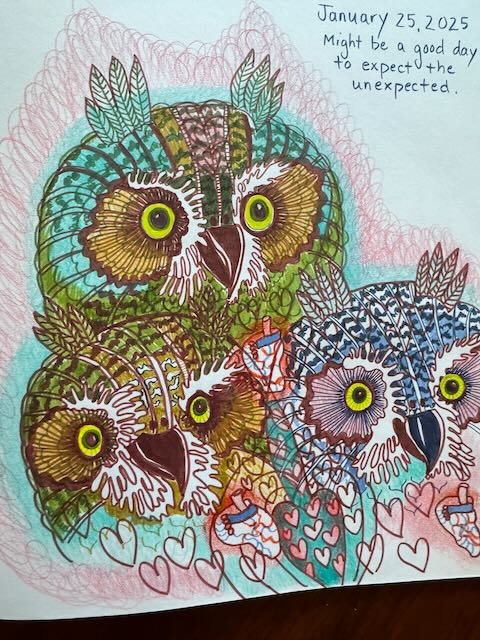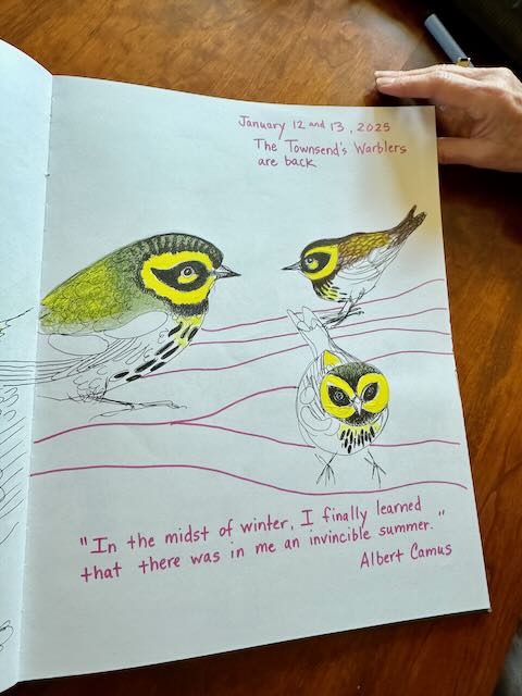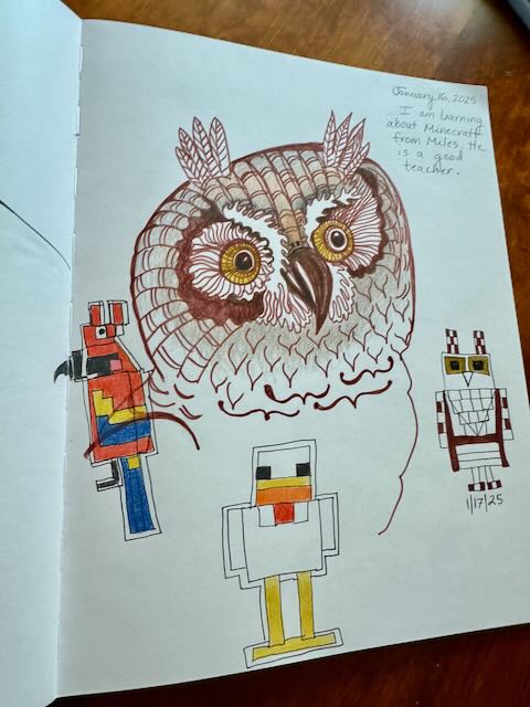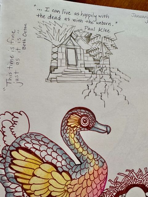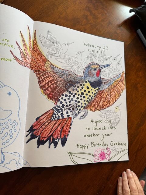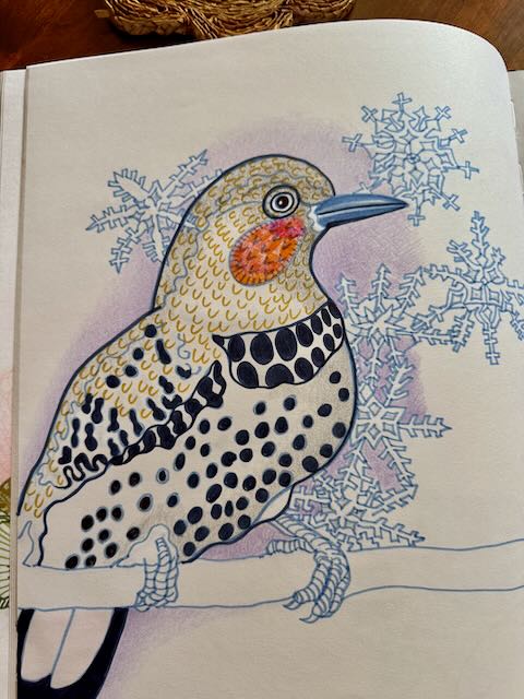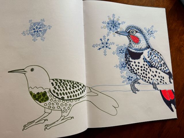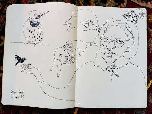 The drawing book she started this past year is large and only is full of birds. I’ve been watching it evolve, and as it fills, bird after bird, it is becoming pretty fantastic. As it’s a journal of sorts, other things creep in. Random thoughts,