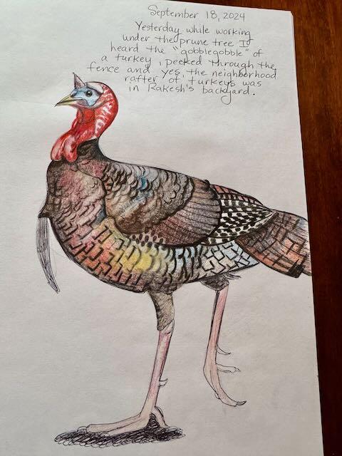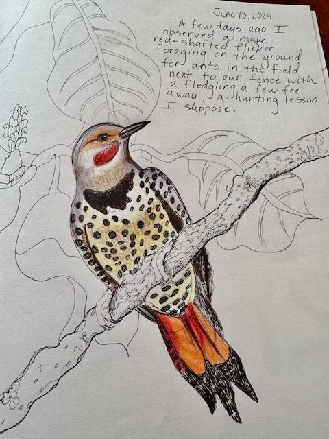 My friend Christine is an artist, a long-time teacher, a good listener. A friend. We’ve been drawing together for years, over lunch at hers or mine. We know a lot of each other’s stories, the same stuff makes us laugh…she’s a gem. The foundation isn’t that though, it’s drawing. We both have the habit of daily drawing, of keeping books and of stacking them up to be consulted for ideas, for memories. Christine has a huge garden which includes vegetables, flowers, fruit…and birds. Birds are her passion and she has bird feeders…of several types.