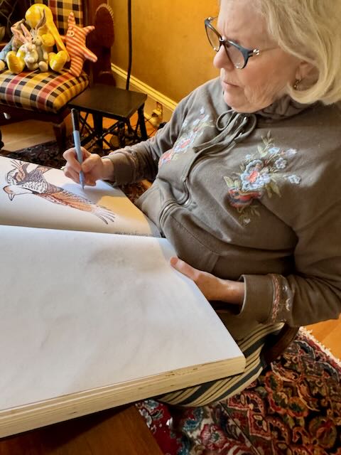 And so the wonderful book of birds is filling up…a years worth of work and thinking and observation. It’s a treasure. And I draw her while she draws them, and on we go. On we go.