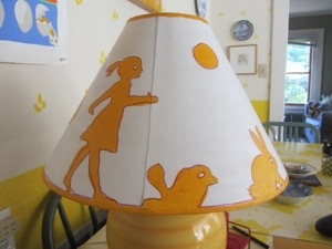 Wow this lampshade on the kitchen table at the beach was really dingy after 20 years…time for an update…and it only took an hour or so….looks FAB when turned off, not so good when turned on…better when I applied marker around the painted images…here’s how it went…back to the drawing board?
